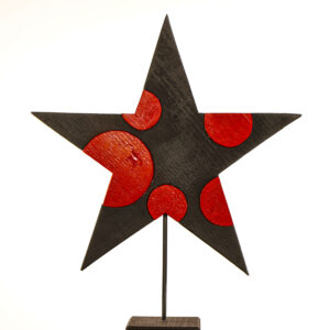 Peter Brauchle wurde in Weil am Rhein geboren. Auch wenn er heute nicht mehr dort lebt, scheint der Blick auf das nahe Mittelgebirge ihn für die Aktion Kunststerne inspiriert zu haben. Der große Stern, 37 × 37 Zentimeter, zeigt dies deutlich: In seine Form hat er mittels roter Kreise symbolisch den typischen Bollenhut eingearbeitet – ein augenzwinkernder Verweis auf die Schwarzwälder Tradition.