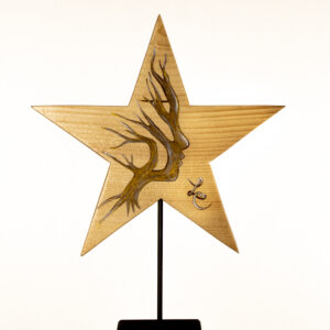 Auch im mittleren Stern bleibt Laura Chaplin ihrem Thema treu. Mit seinen 27 × 27 Zentimetern trägt er unverkennbar die Handschrift der Schweizer Künstlerin. Die Darstellung bewegt sich zwischen Figürlichkeit und einem Hauch von Surrealismus – eine Bildwelt, die Anmut, Leichtigkeit und ein leises vorweihnachtliches Schimmern miteinander verbindet. Die Figuren wirken beinahe engelhaft, als entstammten sie einer Traumsequenz, die sich nur kurz im Holz niederschlägt.
