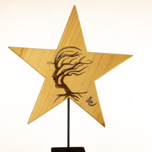 Der große Stern misst 37 × 37 Zentimeter. Ein Metallstab, fest mit einer quadratischen Holzplatte verbunden, verleiht ihm sicheren Stand und bildet den ruhigen Gegenpol zur lebendigen Bildsprache.