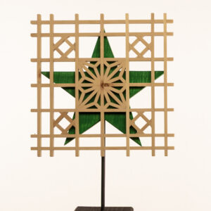 Die Muster entstehen allein durch Stecken, Klemmen und Verschränken – ein leises Handwerk, das in jeder Linie Geduld und Genauigkeit atmet. Vor diesem filigranen Gefüge leuchtet der grün lasierte Stern sanft hervor, als würde er aus dem Inneren des Holzes heraus schimmern.
